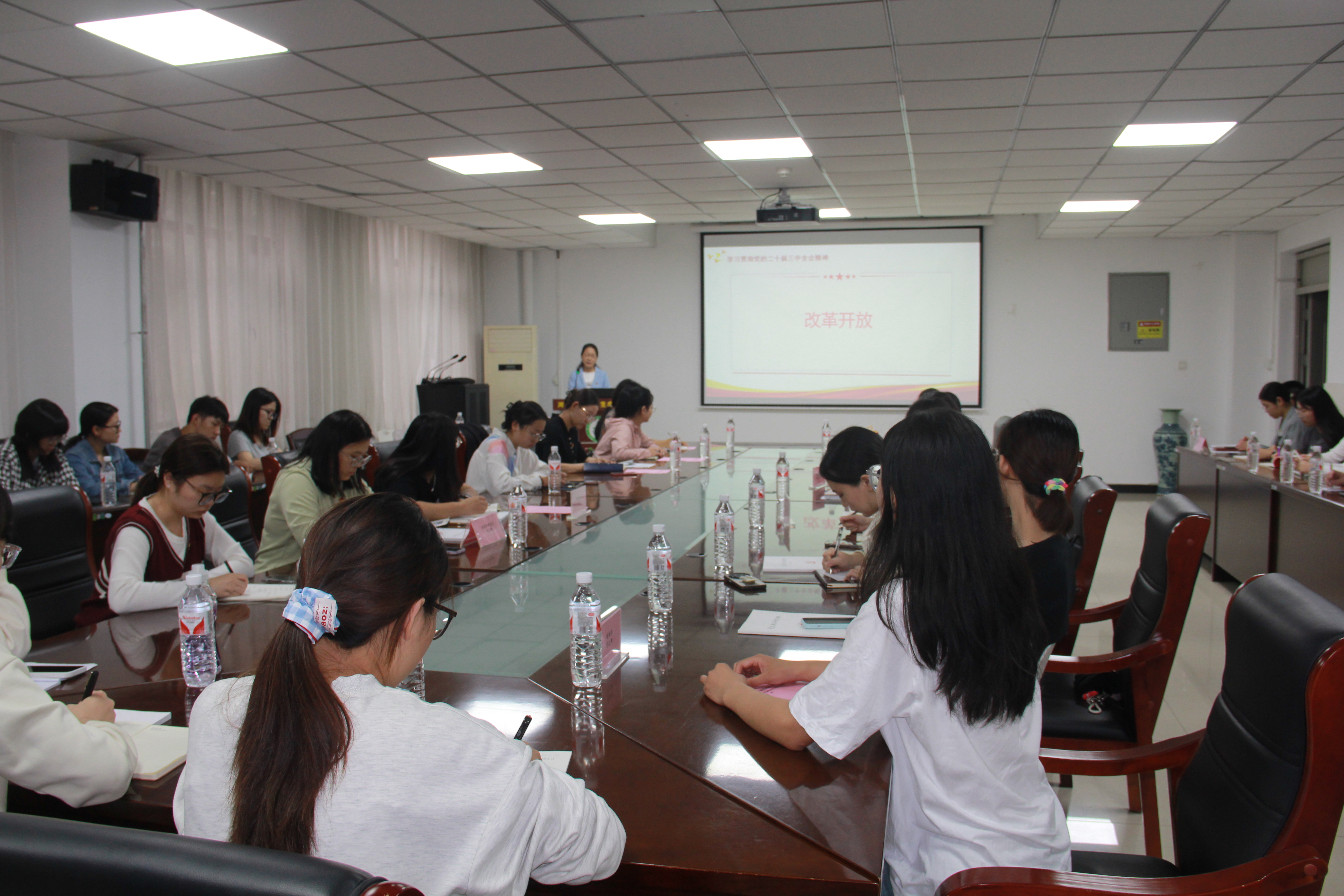 9月29日下午,一帆视频 在理科群3号楼A110会议室召开党的二十届三中全会精神宣讲会,学院党委书记张晓红主讲,党委副书记陆岩主持,学生党支部书记、支委和学生党员40余人参加。